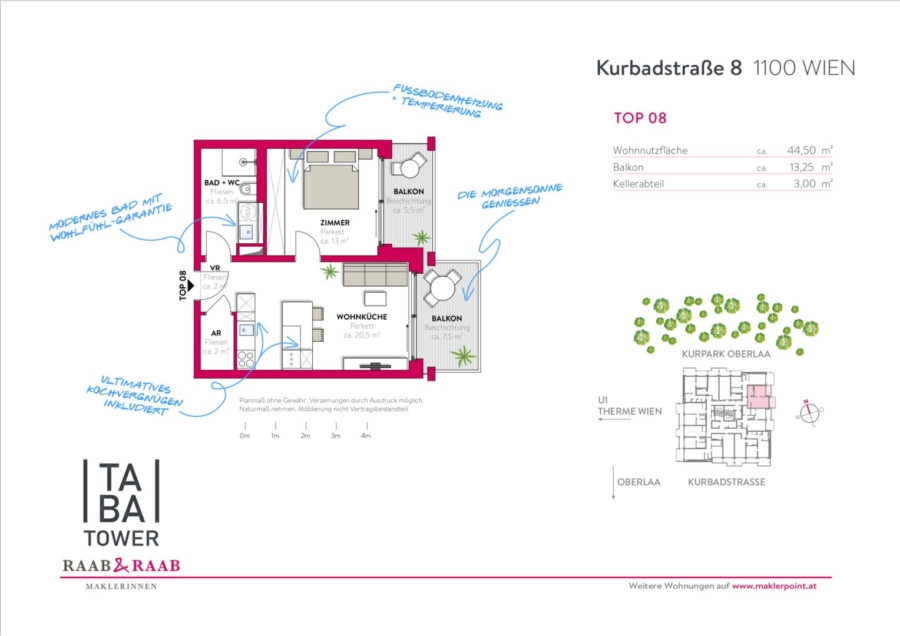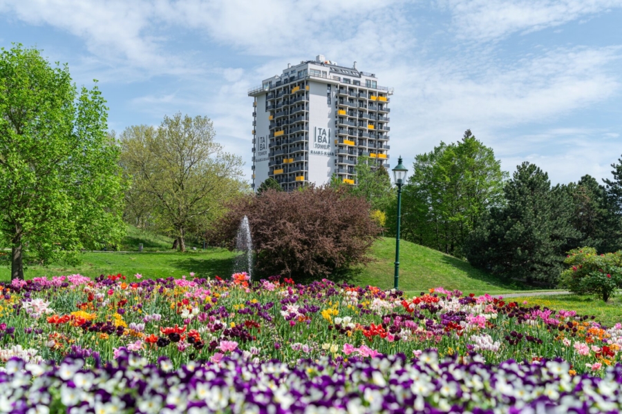 Dank des 860.000 m² großen Kurpark Oberlaa, der wie ein „Garten“ am Fuße des TABA Towers liegt, wohnen künftige Bewohner direkt an einem der schönsten Naherholungsgebiete Wiens. Vom Volleyballplatz, über Skaterpark, Tiergehege, diversen Spiel- und Sportanlagen und wunderschönen, riesengroßen Liegewiesen bietet der Park ein Paradies für Groß und Klein.